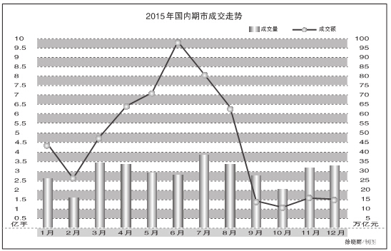 中期协最新统计资料表明,2015年1—12月全国期货市场累计成交量和累计成交额同比分别增长42.78%和89.81%。12月当月,全国期货市场成交量3.37亿手,成交额为15.11万亿元,同比分别增长6.35%和下降73.83%,环比分别增长3.79%和下降5.55%。