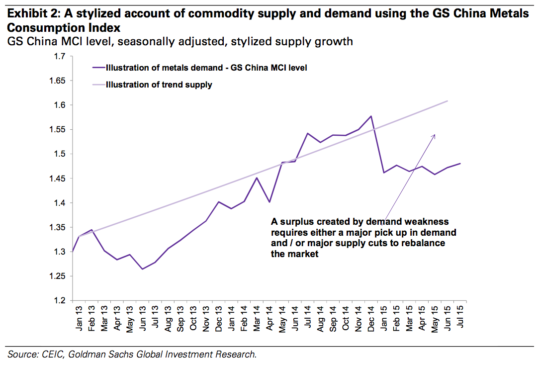 高盛分析师Max Layton通过金属消费指数指出了问题所在。短期内,中国的消费已经下降,但是供给却在增加。