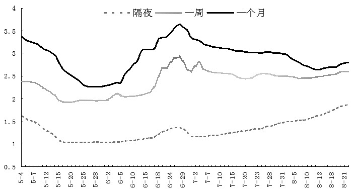 发布时间:2015-08-25 00:29:06 | 点击:53408月24日Shibor利率市场六涨一跌一平,所有利率均有上行趋势,资金面供应偏紧迹象明显。代表性利率的7天Shibor微跌0.20个基点至2.597%,环比上周小幅上行。如果央行继续按兵不动,人民币贬值势头停止,资金面趋紧态势延续的可能性较大。隔夜利率涨1.90个基点至1.866%,继续稳步小幅上行。14天利率上涨0.20个基点至2.713%。一个月利率涨2.10个基点至2.81%。在人民币汇率企稳后,央行连续净投放货币超过3000亿元,但对市场流动性偏紧的局面改善有限。中长期利率开始小幅上行,3个月、6个月、9个月和1年期利率分别报3.0900%、3.2330%、3.2830%、3.4000%。