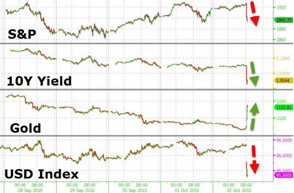 其它市场表现方面,非农报告出炉后美股标普指数和10年期美债收益率重挫,金价则大幅飙升。