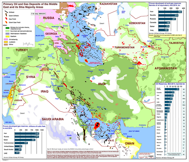 (下图由美国空军特殊军事行动学校的兼职教授M.R. Izady绘制。根据这张图显示,较深的绿色区域是什叶派居住地,而浅绿色的是逊尼派居住地,黑色的点块显示的是石油油田,红色是天然气产区。)